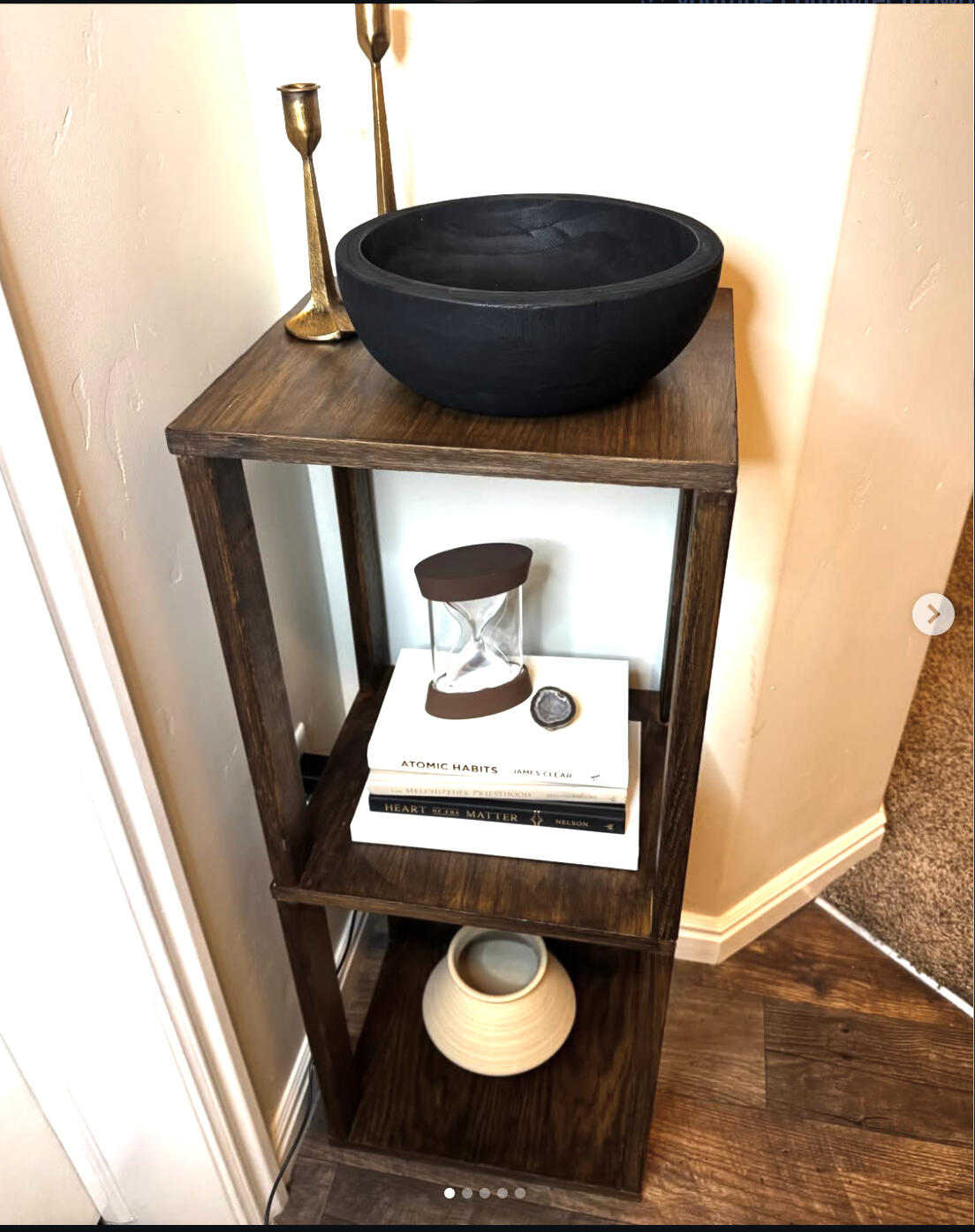 Solid oak construction with a rich walnut stain and durable polyurethane finish to protect the surface. Clean, modern design that works great as a plant stand, corner table, or decorative shelf.Dimensions: 16”L × 16”W × 30”H